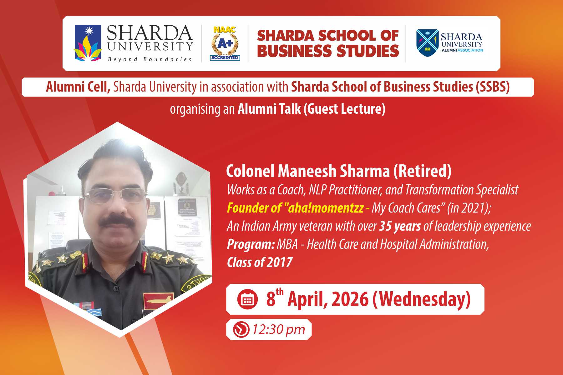 The Alumni Cell, Sharda University in association with Sharda School of Business Studies (SSBS) is organising an insightful alumni guest lecture on 8th April 2026. The key speaker will be Col. Maneesh Sharma, an alumnus of the MBA in Health Care and Hospital Administration (Class of 2017). An Indian Army veteran with over 35 years of leadership experience, Col. Maneesh brings a wealth of knowledge shaped by discipline, resilience, and strategic thinking. He is a Founder of "aha!momentzz - My Coach Cares” (in 2021) and currently works as a Coach, NLP Practitioner, and Transformation Specialist, helping individuals unlock clarity and align performance with purpose.