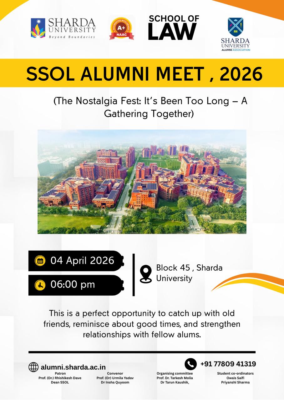 The Sharda School of Law, in association with the Alumni Cell of Sharda University, is delighted to organise an Alumni Meet (The Nostalgia Fest: It’s Been Too Long – A Gathering Together), scheduled for 4th April 2026. This gathering offers a wonderful opportunity to reconnect with former classmates, faculty, and cherished memories of the campus.