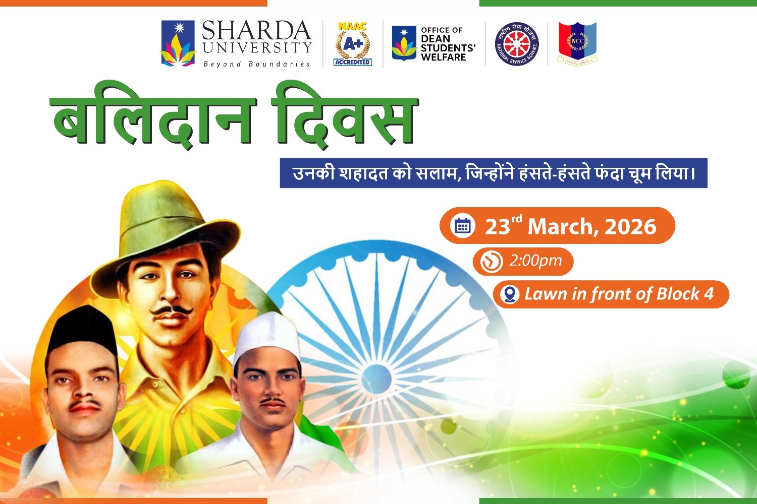 The Office of Dean Students’ Welfare, Sharda University is going to organize Balidan Diwas on 23 March 2026 in front of Lawn 4 to honor the sacrifice of Bhagat Singh, Shivaram Rajguru, and Sukhdev Thapar.