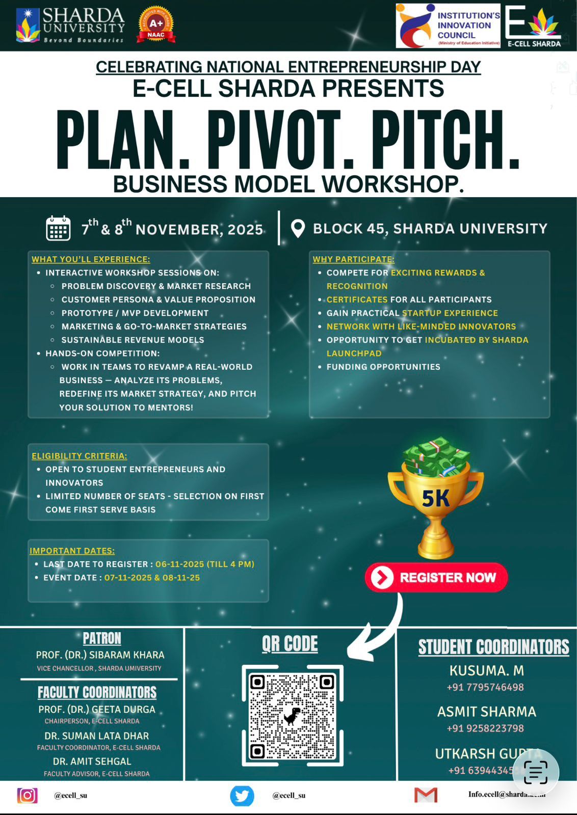Through interactive sessions and mentor-led guidance, students will gain practical experience in transforming ideas into viable business models. The workshop concludes with a Business Model Competition, where teams present their startup ideas to a panel of judges and stand a chance to win rewards, certificates, and incubation opportunities at Sharda Launchpad.