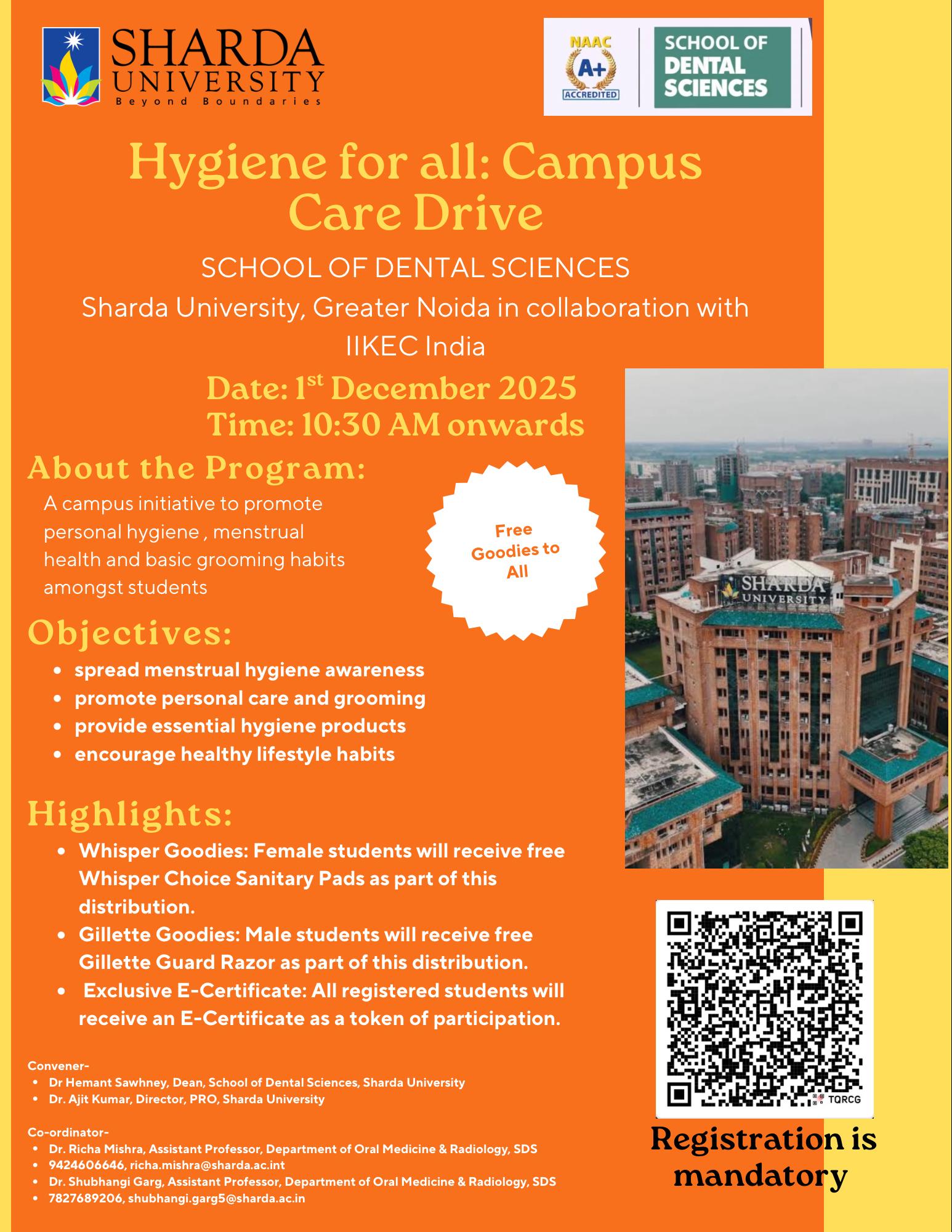 The Campus Connect Programme conducted by School of Dental Sciences, Sharda University, Greater Noida in collaboration with IIKEC India aims at promoting personal hygiene, menstrual health awareness, and basic grooming habits among college students. The initiative will include an informative session along with the distribution of free sanitary pads to 1200 female students, Gillette Guard razors to 800 male students and refreshments for all the participants.