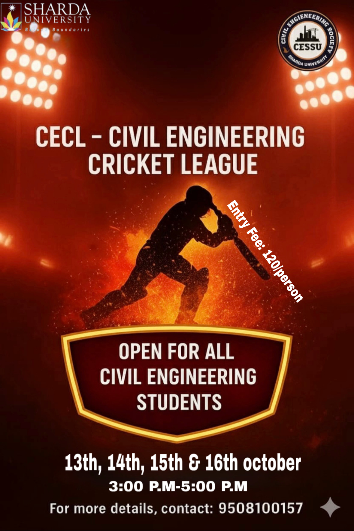 The Civil Engineering Cricket League (CECL) is an intra-departmental cricket tournament exclusively organized for Civil Engineering students, with active participation from faculty members. Spanning over 4 days, the event will feature 6 teams, including both student-only and student-faculty mixed teams.