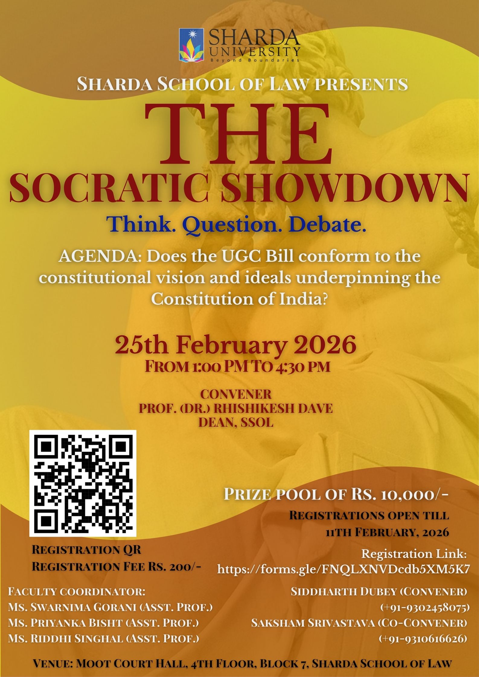 The Debating Committee of Sharda School of Law is thrilled to announce that after a great success of शास्त्रार्थ  शुक्रवार- WEEKLY FRIDAY DEBATES, Part I and II and other such debating events, it has decided to conduct THE SOCRATIC SHOWDOWN- THINK, QUESTION, DEBATE on the Topic “Does the UGC Bill conform to the Constitutional Vision and ideals underpinning the Constitution of India” on 25th February 2026 - an opportunity open to students from all the schools of our prestigious university.