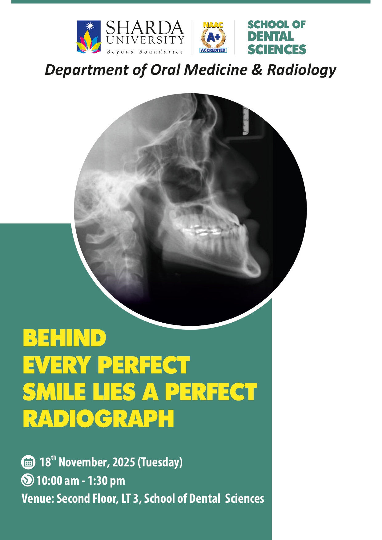 World Radiology Day is observed every year on November 8 to honor the essential role of radiographers and highlight the achievements of medical imaging in improving healthcare. This global day commemorates the anniversary of Wilhelm Conrad Roentgen’s groundbreaking discovery of X-rays in 1895 an innovation that changed the landscape of medical diagnosis and treatment. Department of Oral Medicine & Radiology, School of Dental Sciences, Sharda University is organizing a Table model exhibition and demonstration along with E-Poster competition on the occasion of “World Radiology Day 2025” for the under graduate students of  School of Dental Sciences on 18th November 2025.