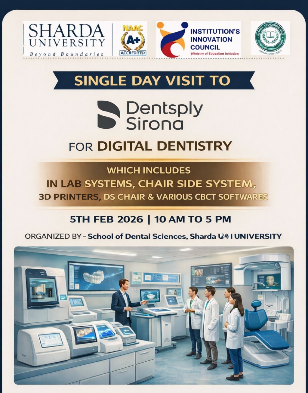 School of Dental Sciences and Institution's Innovation Council, Sharda University in collaboration with Dentsply Sirona has planned an industrial visit to their office to provide comprehensive exposure to contemporary digital technologies, transforming modern dental practices scheduled on 5th february, 2026.This hands-on training session aims to familiarize participants with the complete digital workflow from diagnosis to treatment planning and fabrication.