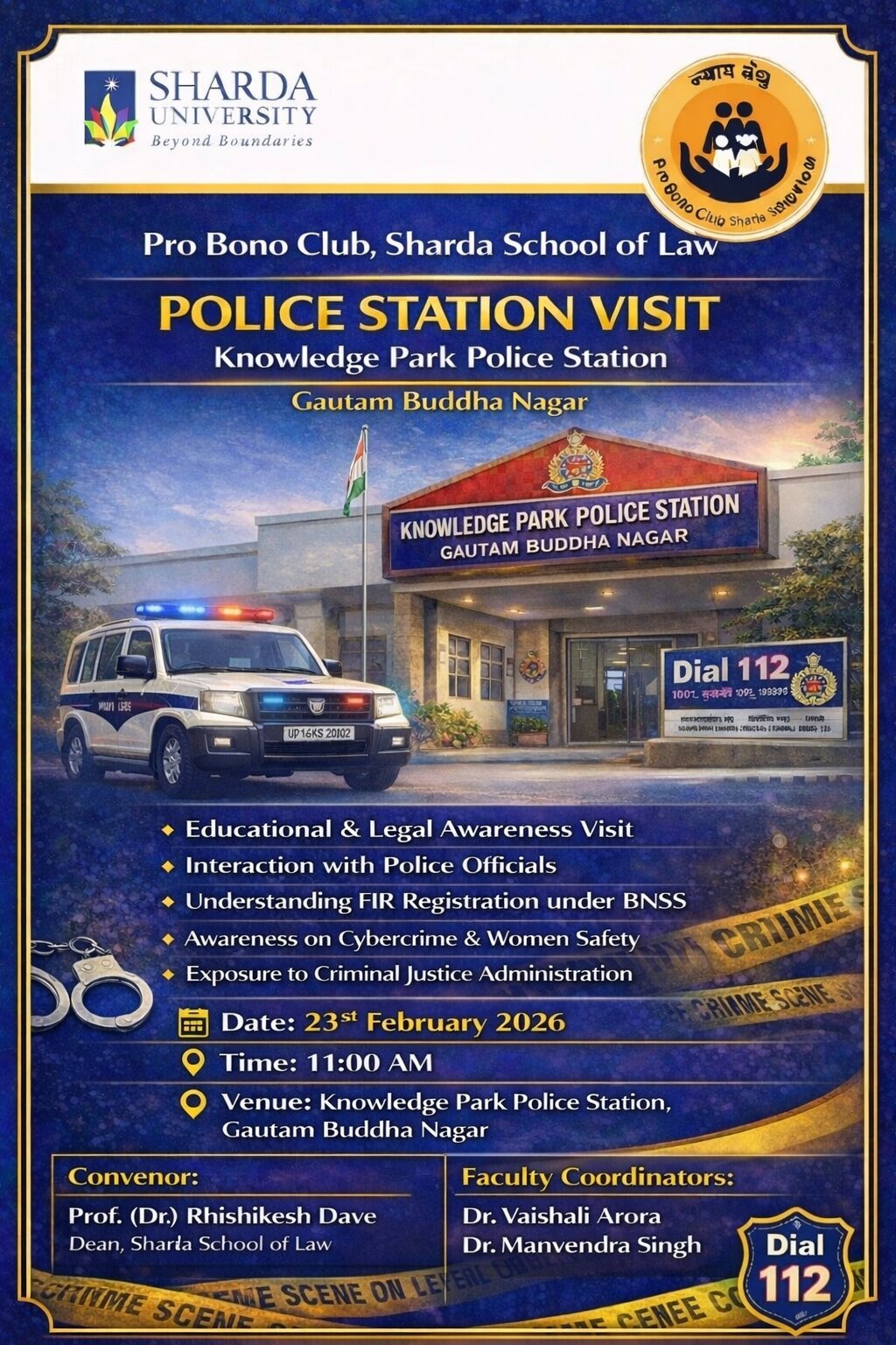Pro Bono Club, Sharda School of Law, Sharda University, is organising an Educational Visit to Knowledge Park Police Station, Greater Noida, with the aim of providing students with practical exposure to the functioning of the criminal justice system and fostering legal awareness through direct interaction with law enforcement authorities.