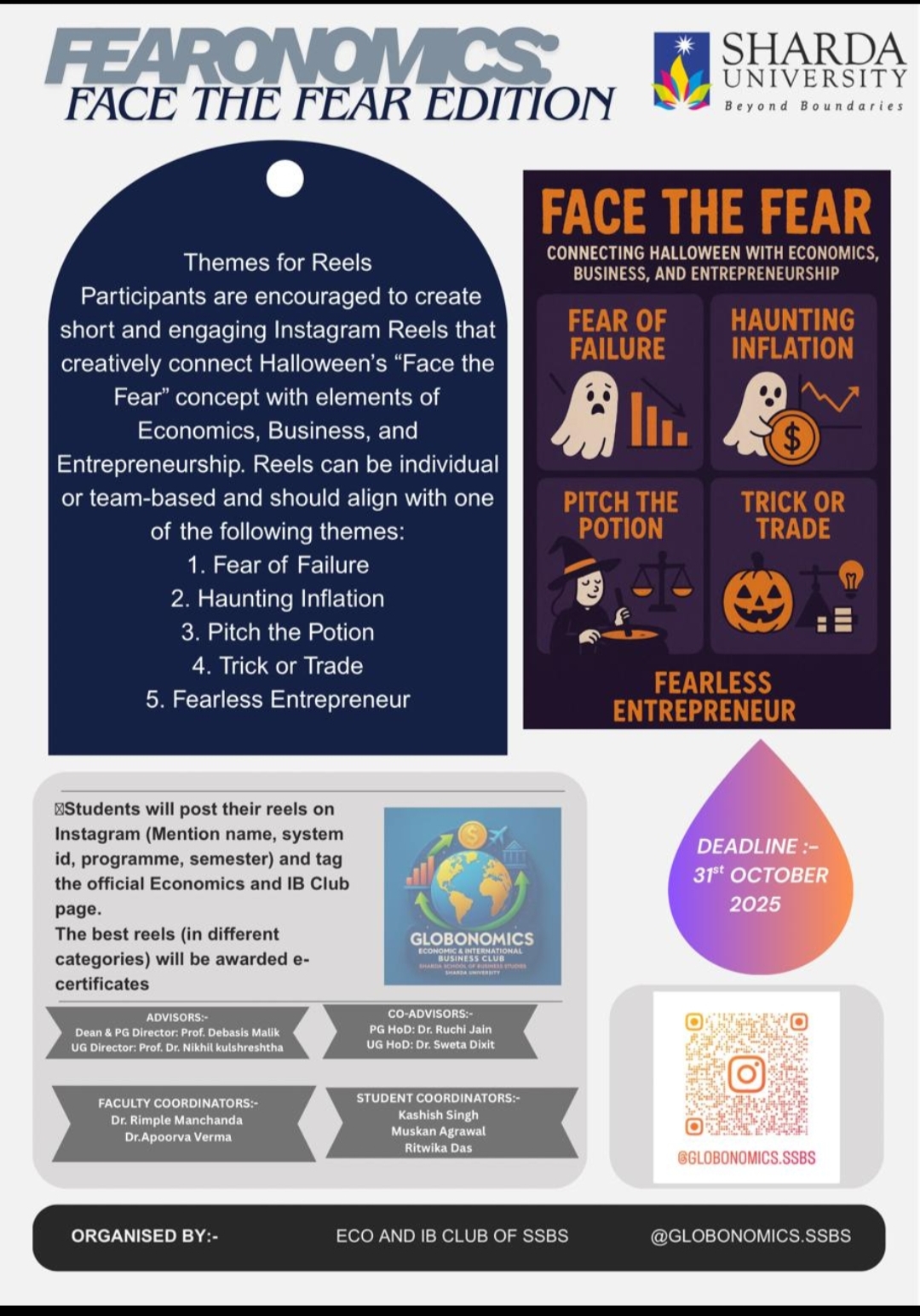 “Fearonomics: Face the Fear Edition” is an event being organized by the Globonimce (Eco & IB Club ,SSBS), aims to ignite creativity, confidence, and entrepreneurial thinking among students, all wrapped in the festive spirit of Halloween.The event encourages participants to think innovatively and express economic and business concepts through engaging and fun activities. Students will be creating and posting reels on the official Economics and IB Club Instagram page, showcasing their ideas, business pitches, and creative interpretations of the “Face the Fear” theme. Through this interactive approach, the event seeks to blend learning with entertainment, promoting a fearless and entrepreneurial mindset among students while enhancing their digital engagement, communication, and presentation skills.