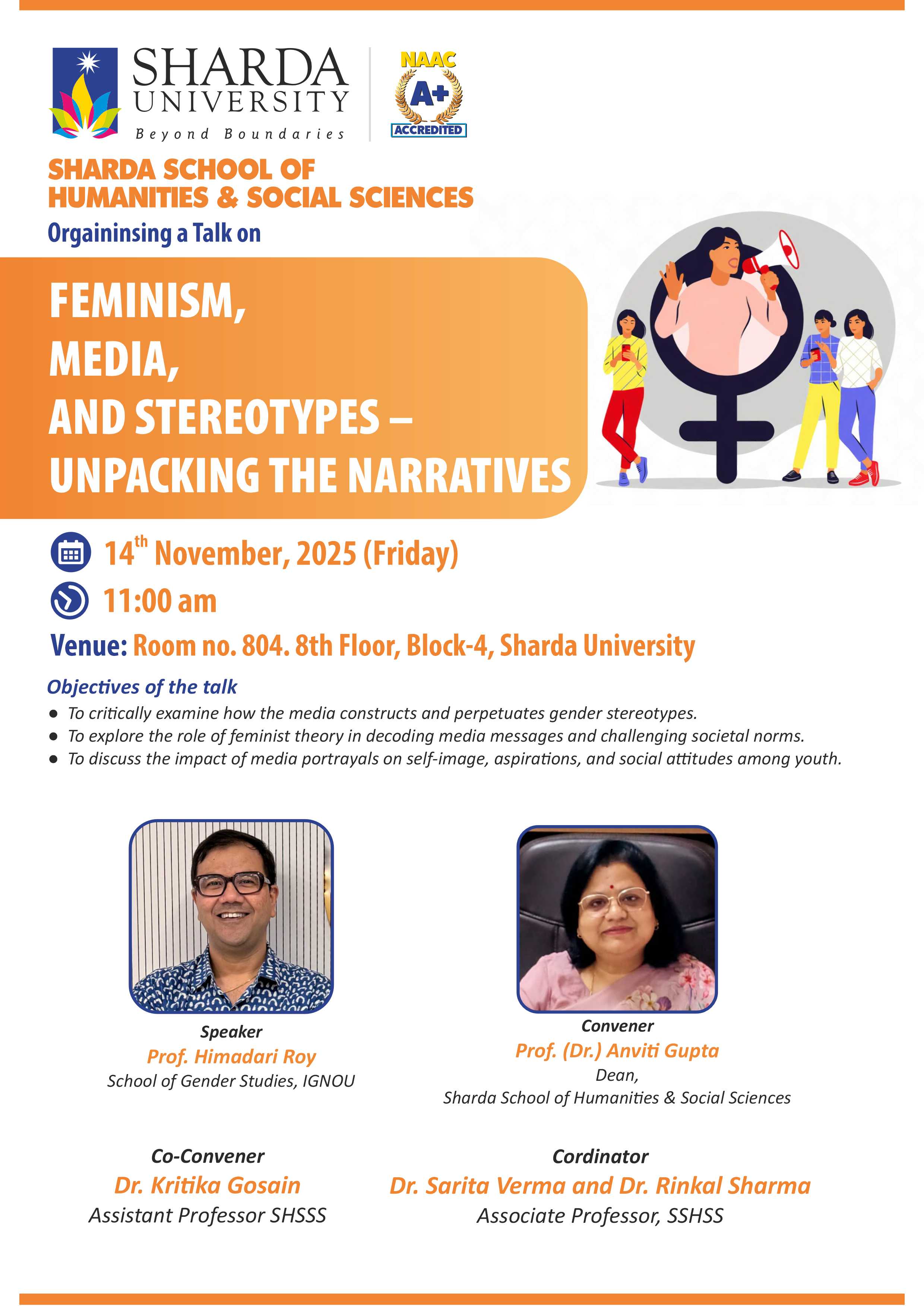 Sharda School of Humanities and Social Science, Sharda University is organizing a talk on Feminism, Media, and Stereotypes for the undergrad and postgrad students.