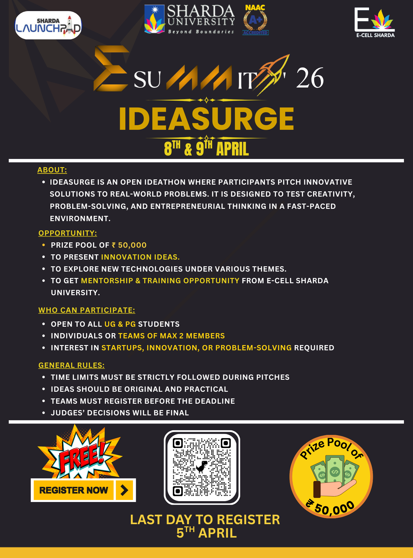 IdeaSurge is an open ideathon where participants pitch innovative solutions to real-world problems. It is designed to test creativity, problem-solving skills, and entrepreneurial thinking in a fast-paced environment.