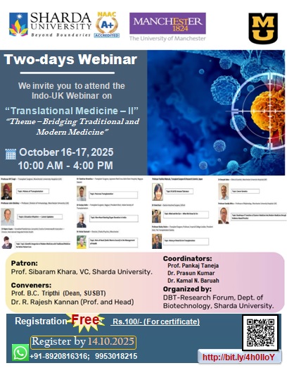 OR, Indo-UK Webinar on “Translational Medicine - II” Theme - Bridging Traditional and Modern Medicine [October 16-17, 2025, 10:00 AM - 4:00 PM]