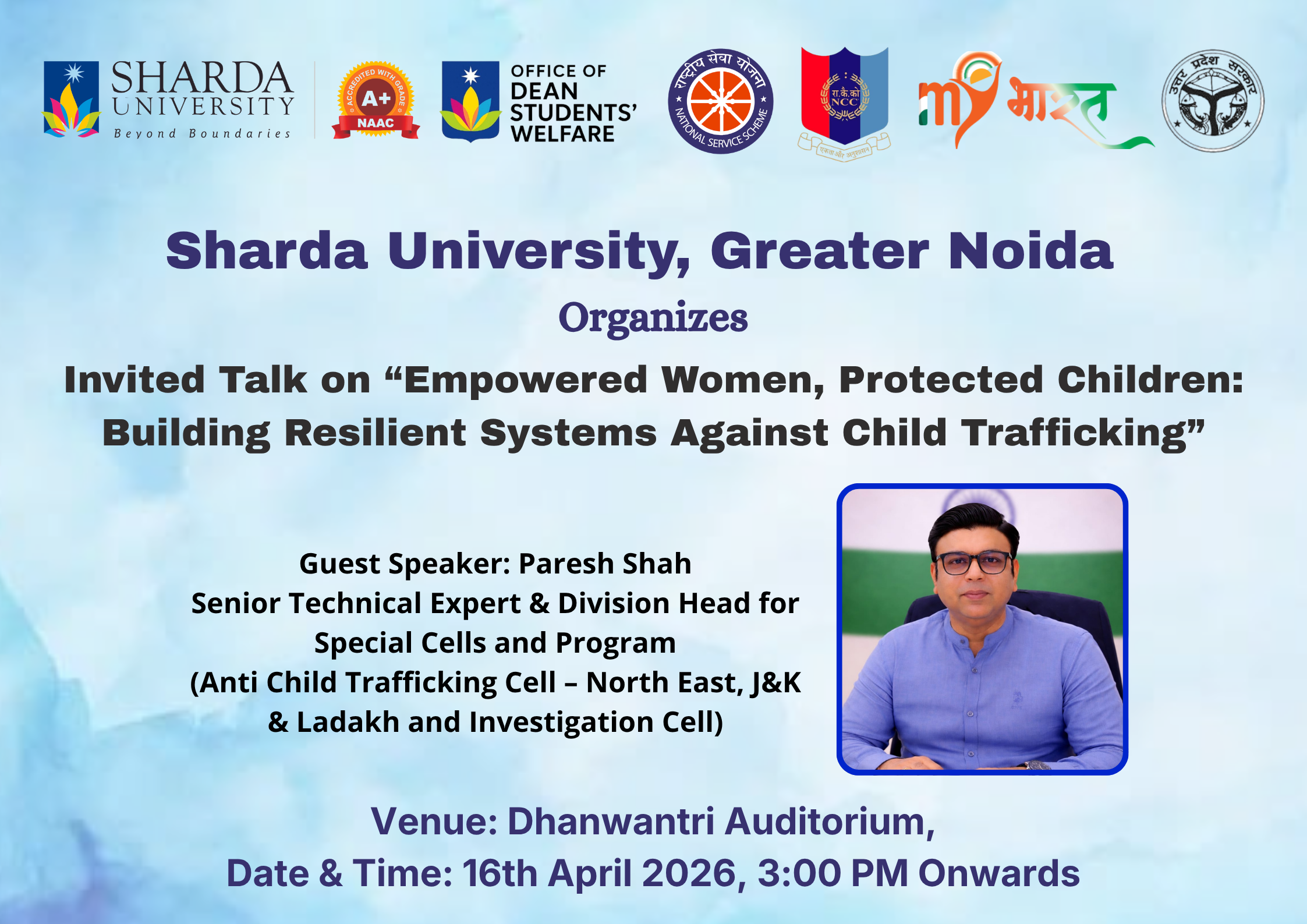 This invited talk focuses on the critical intersection of women empowerment and child protection, highlighting how Naari Shakti can play a transformative role in preventing child trafficking. The session will explore real-world challenges, policy frameworks, and ground-level interventions, offering students valuable insights into building resilient and responsive systems that safeguard vulnerable children.