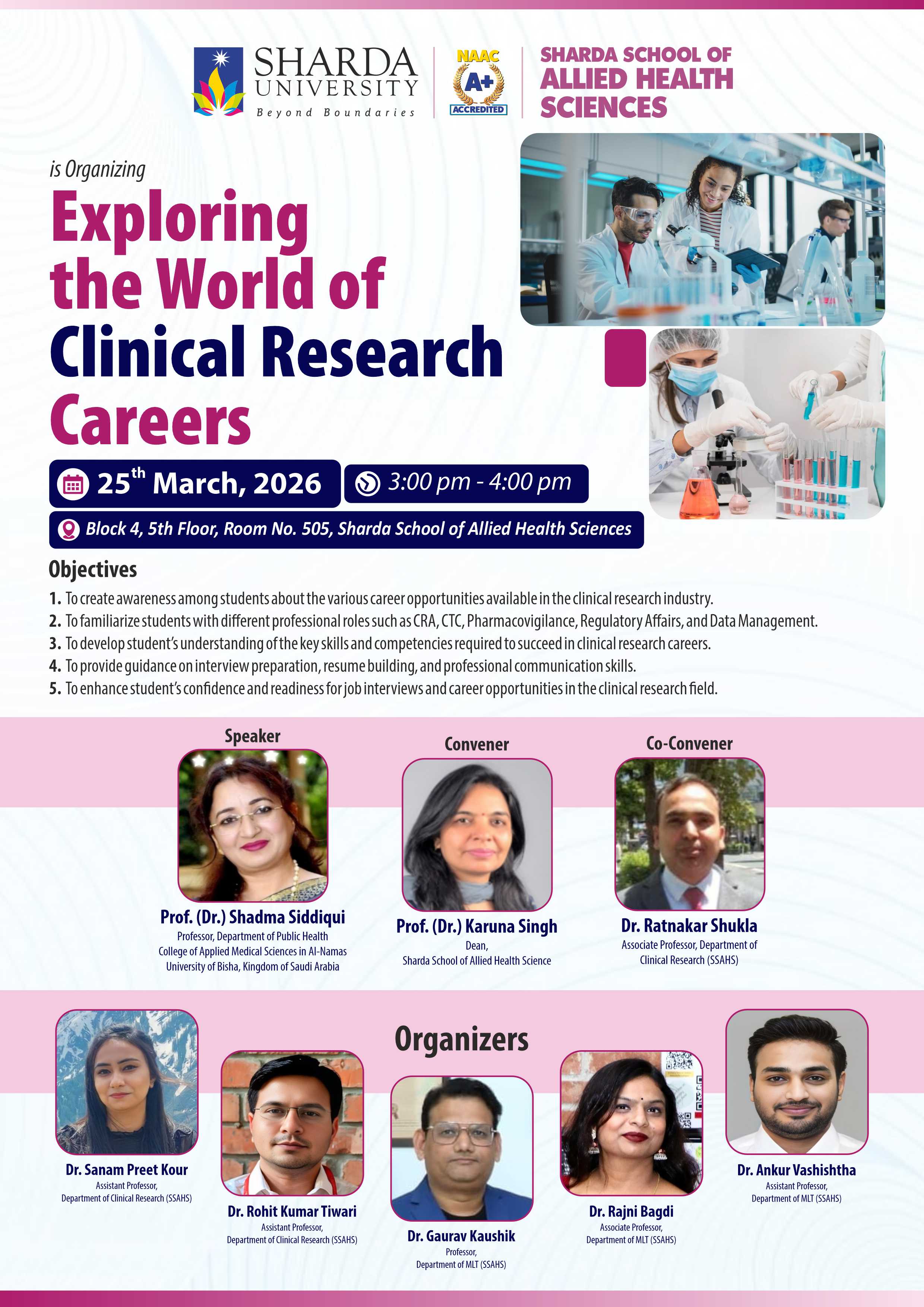 Sharda School of Allied Health Sciences, Sharda University is organizing an Invited talk on Exploring the World of Clinical Research Careers” scheduled on 25 March 2026.