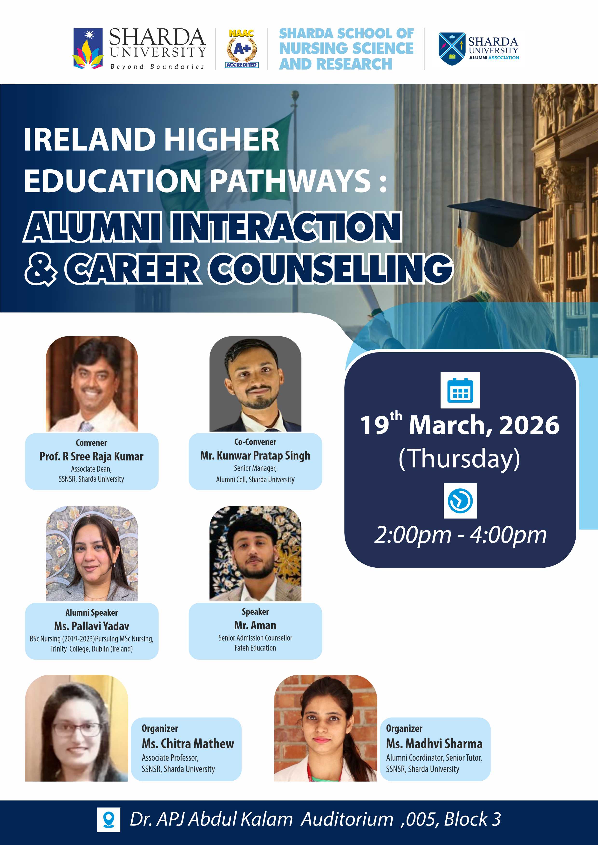 Sharda School of Nursing Science and Research is organizing an event in collaboration with the Alumni Cell, Sharda University, for nursing students regarding the real-life experience of an alumni at Sharda University and her