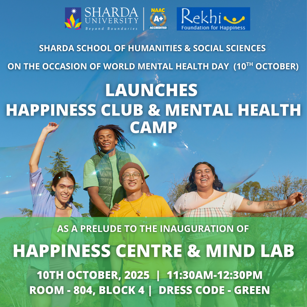 Launch of Happiness Club & Mental Health Camp is organised by Sharda School of Humanities & Social Sciences (SSHSS) as a prelude to the inauguration of Happiness Centre & Mind Lab in association with the Rekhi Foundation for Happiness. The event aims to create awareness on the importance of Happiness in our lives and encourage everyone to participate in the Mental Health Camp for evaluation, assessment & brief counselling of their current Mental Health concerns. This will be followed by an insightful session on the WHO theme for World Mental Health Day, 2025 - “Mental Health in Humanitarian Emergencies” by Prof. (Dr.) Anviti Gupta (Dean - SSHSS, Professor of Psychology, Founder & Clinic Head - Abhivyakti Wellness Clinic & Counselling Cell, Clinical Hypnotherapist and Counselling Psychologist)