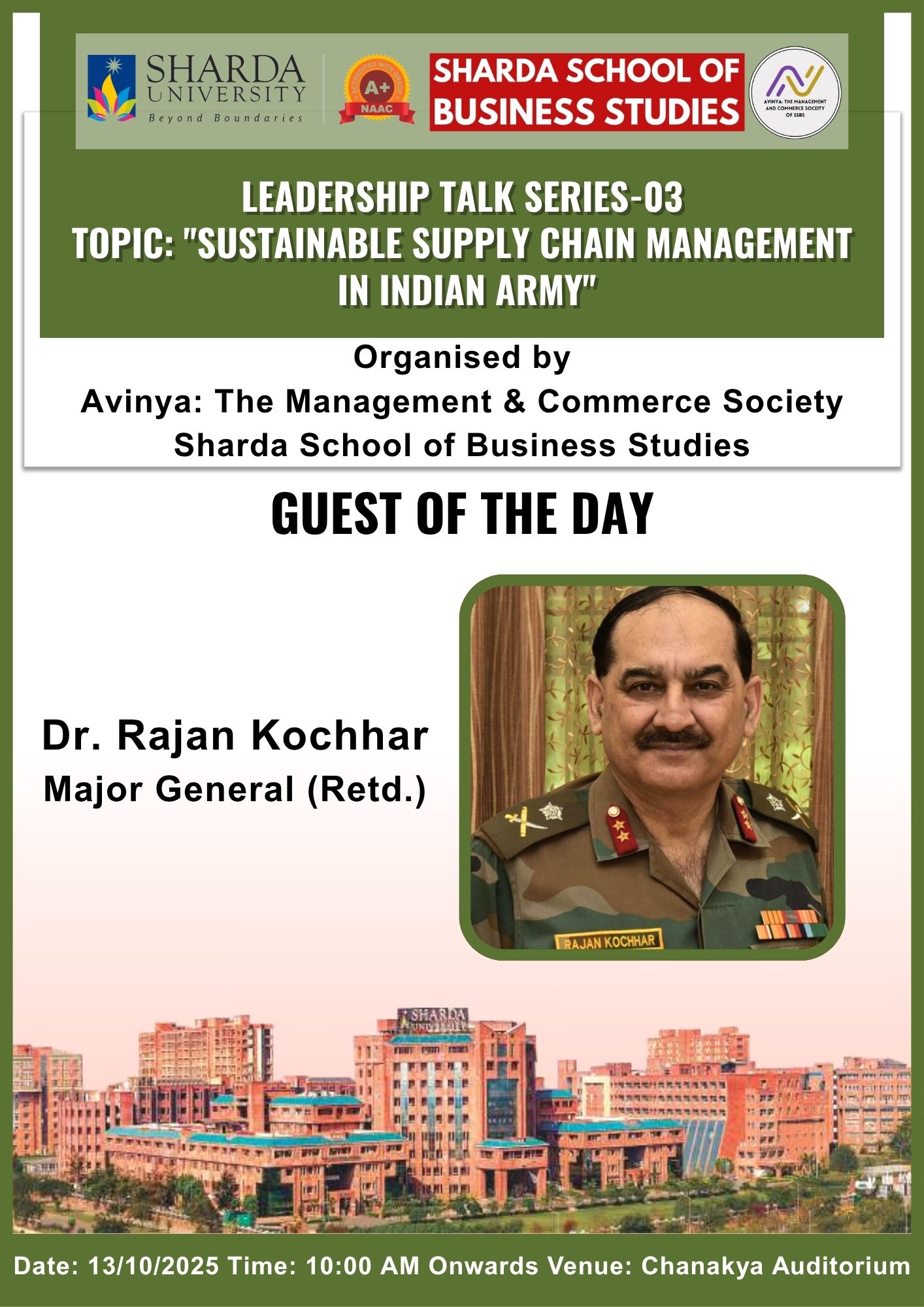 The Leadership Talk Series–03 aims to provide an insightful session on the concept of Sustainable Supply Chain Management (SSCM), focusing on its application within the Indian Army. The talk will explore how the armed forces efficiently manage logistics, resources, and supply chains while maintaining sustainability, resilience, and readiness under challenging conditions.