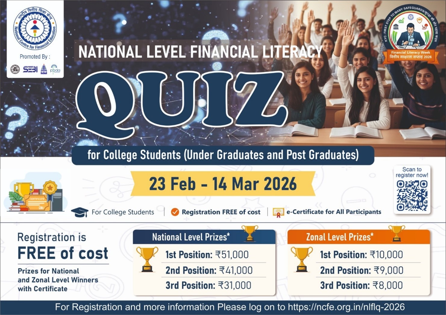 This is an online proctored quiz conducted by National Centre for Financial Education (NCFE) in coordination with financial sector regulators, viz. RBI, SEBI, IRDAI and PFRDA. This quiz will be conducted in English and Hindi language from February 23, 202611:00 AM – March 14, 2026, 11:59 PM.