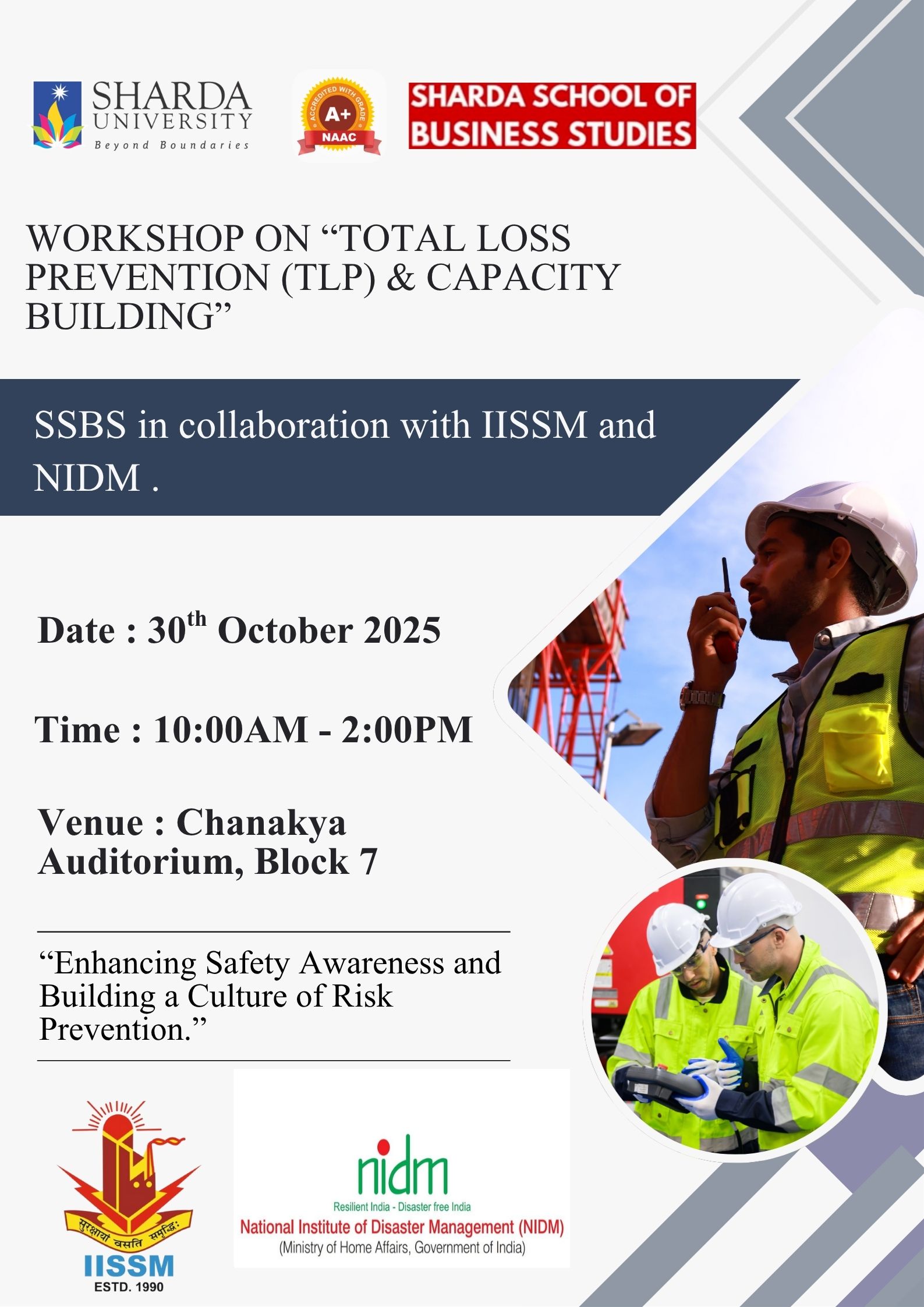 Sharda School of Business Studies, in collaboration with the International Institute of Security and Safety Management (IISSM) and the National Institute of Disaster Management (NIDM), Ministry of Home Affairs, Government of India, is organizing a One-Day Workshop on “Total Loss Prevention (TLP) and Capacity Building.” The workshop aims to enhance awareness, preparedness, and risk prevention competencies among students and faculty members. It focuses on building institutional capacity in line with UGC guidelines, NEP 2020, and the Prime Minister’s National Safety Mandates, empowering participants with essential knowledge on safety management and disaster resilience.