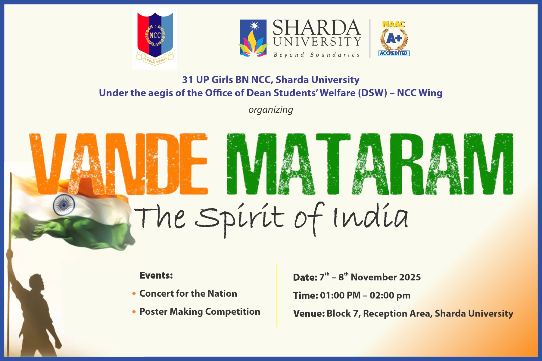 The NCC Unit cordially invites you (Open to all Students) to join us in celebrating the 150th Anniversary of the iconic patriotic song Vande Mataram by participating in a Poster Making Competition on Saturday, 8th November 2025, in Block 7.