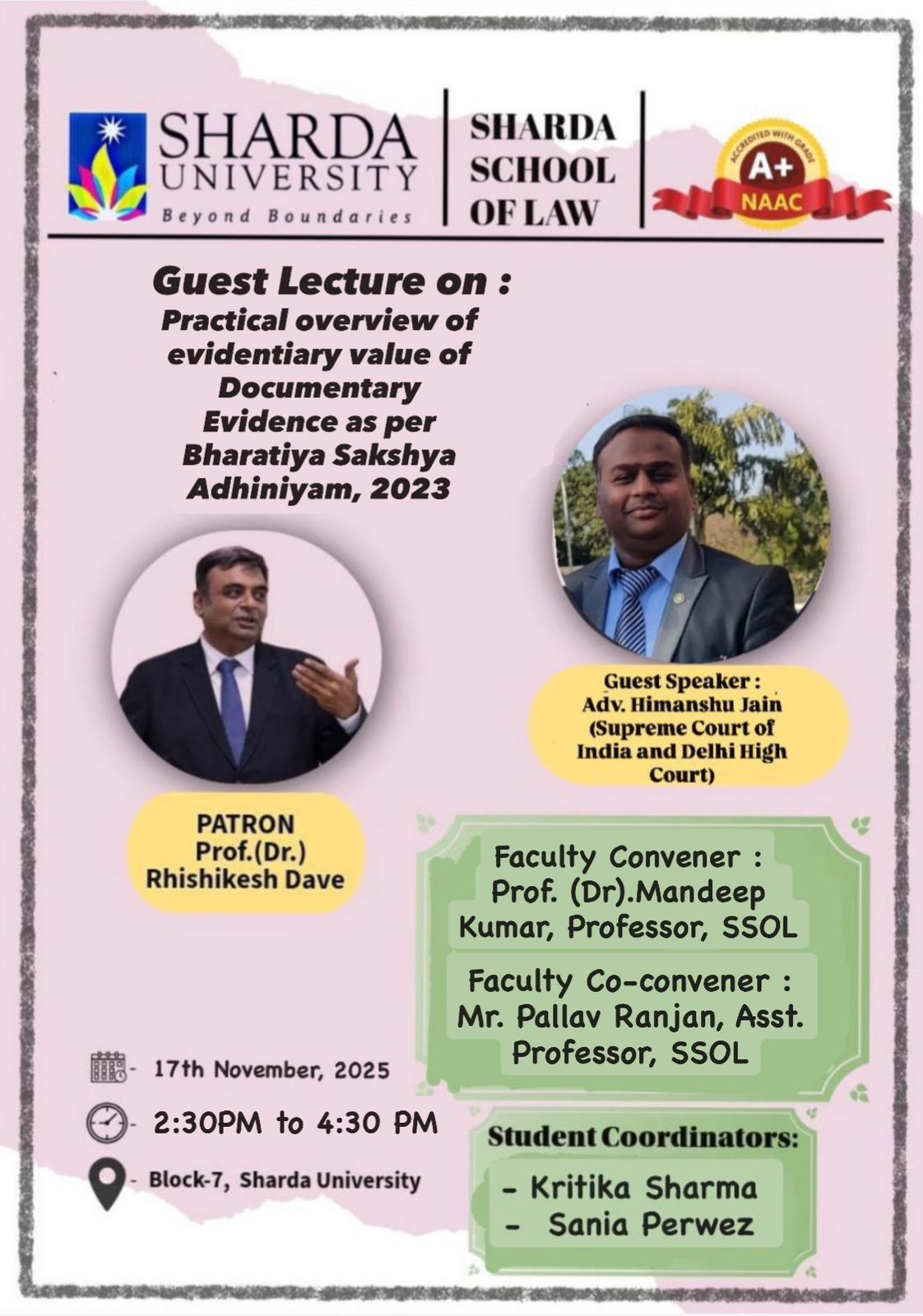 Sharda School of Law, Sharda University, is organising a distinguished lecture on “Practical overview of evidentiary value of Documentary Evidence as per Bharatiya Sakshya Adhiniyam, 2023”. The session will be delivered by Adv. Himanshu Jain (Supreme Court of India and Delhi High Court) Panel counsel for Directorate of Enforcement and  Founding member of Lex Focus Legit LLP and Himanshu Jain and Associates. This guest lecture gives LLB students a concise, high-impact overview of the Bharatiya Sakshya Adhiniyam, 2023, transforming outdated evidence law into an electronic-age framework. It builds practical courtroom skills, aligns with exams and moots, and prepares future lawyers to confidently handle real cases involving both traditional and electronic evidence.