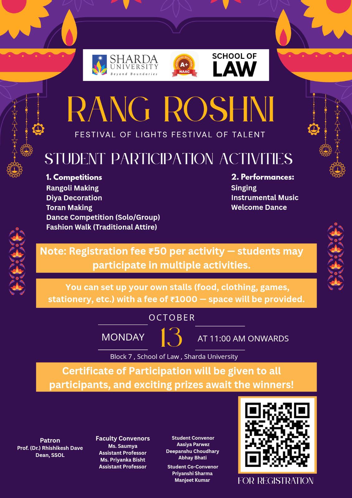 Sharda School of Law, Sharda University, is organising a Rang Roshni: A Festive Fusion to be held on 13th October 2025 at Block-7, Sharda University, from 11.00 AM to 4.00 PM.
