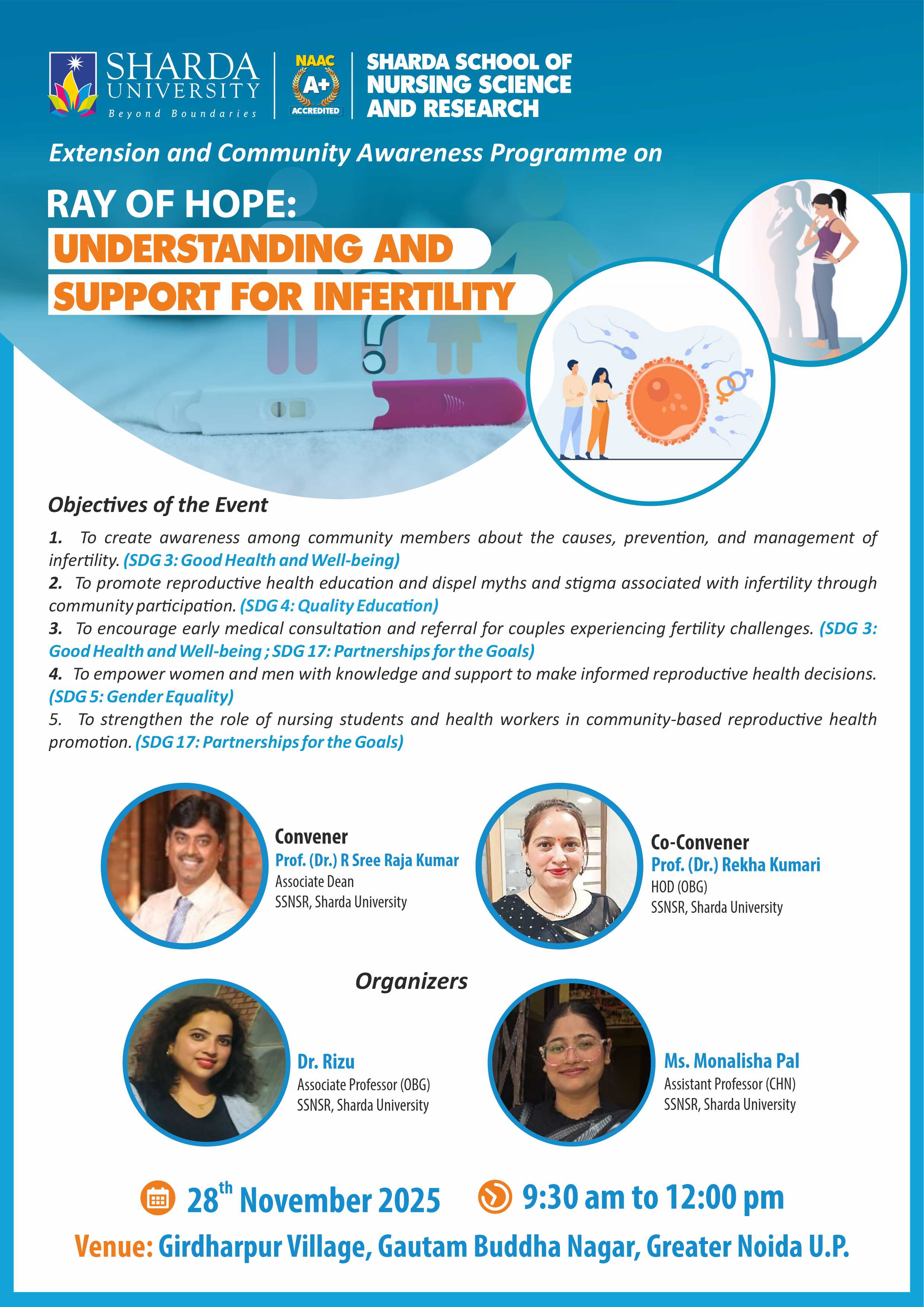 Sharda School of Nursing Science & Research (SSNSR), Sharda University is organizing an Extension and Community Awareness Programme on “आशाकीकिरण: बांझपनकेप्रतिसमझऔरसहयोग” (Ray of Hope: Understanding and Support for Infertility) on 28th Nov. 2025 at Girdharpur village, Gautam Buddha Nagar U.P.