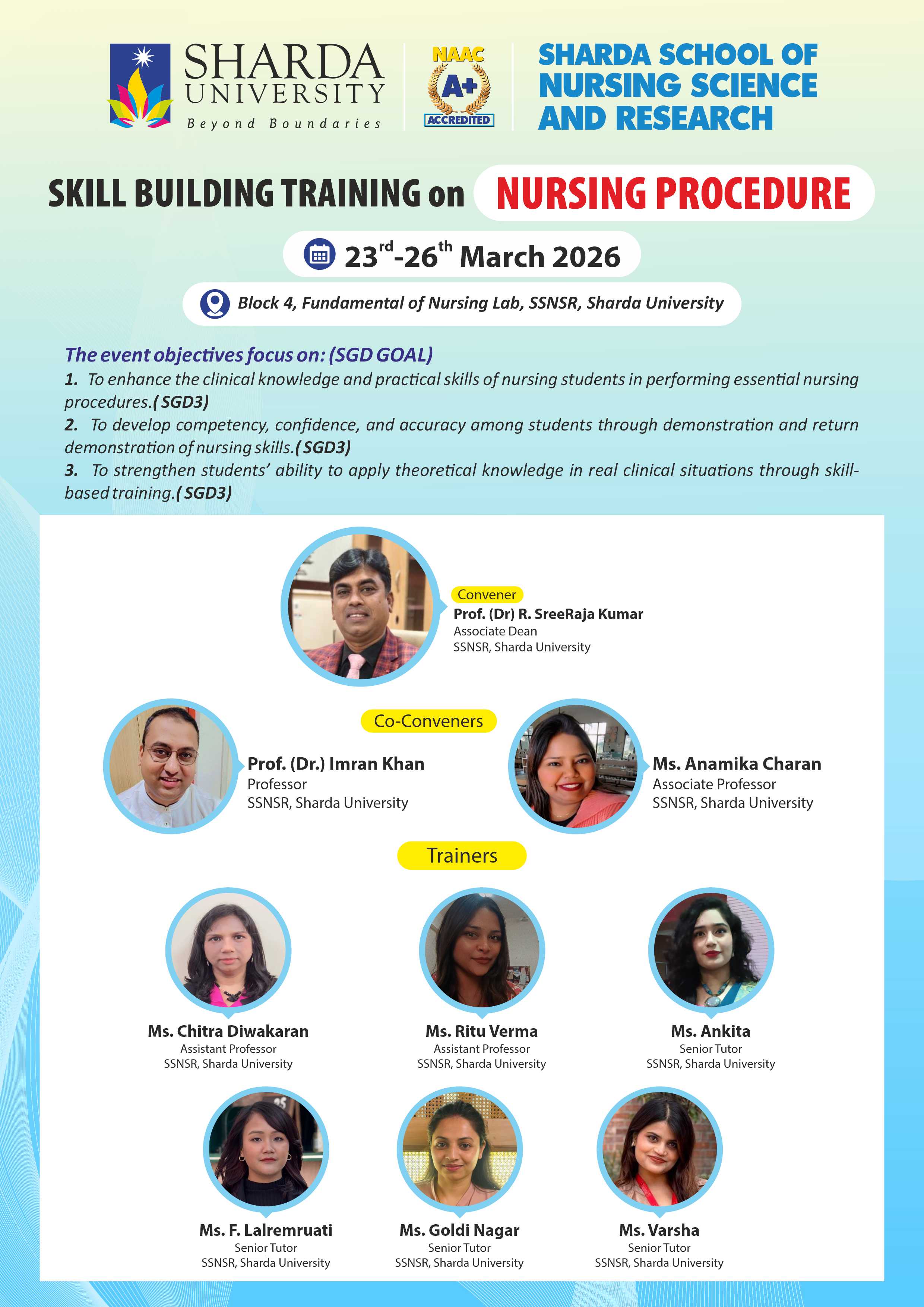 The Skill Building Training on Nursing Procedure will be organized to enhance the clinical competence and practical abilities of nursing students. The program will aim to bridge the gap between theoretical knowledge and practical application by providing hands-on experience in essential nursing procedures. It will focus on developing confidence, accuracy, and professional responsibility among students while performing various nursing skills required in clinical practice.