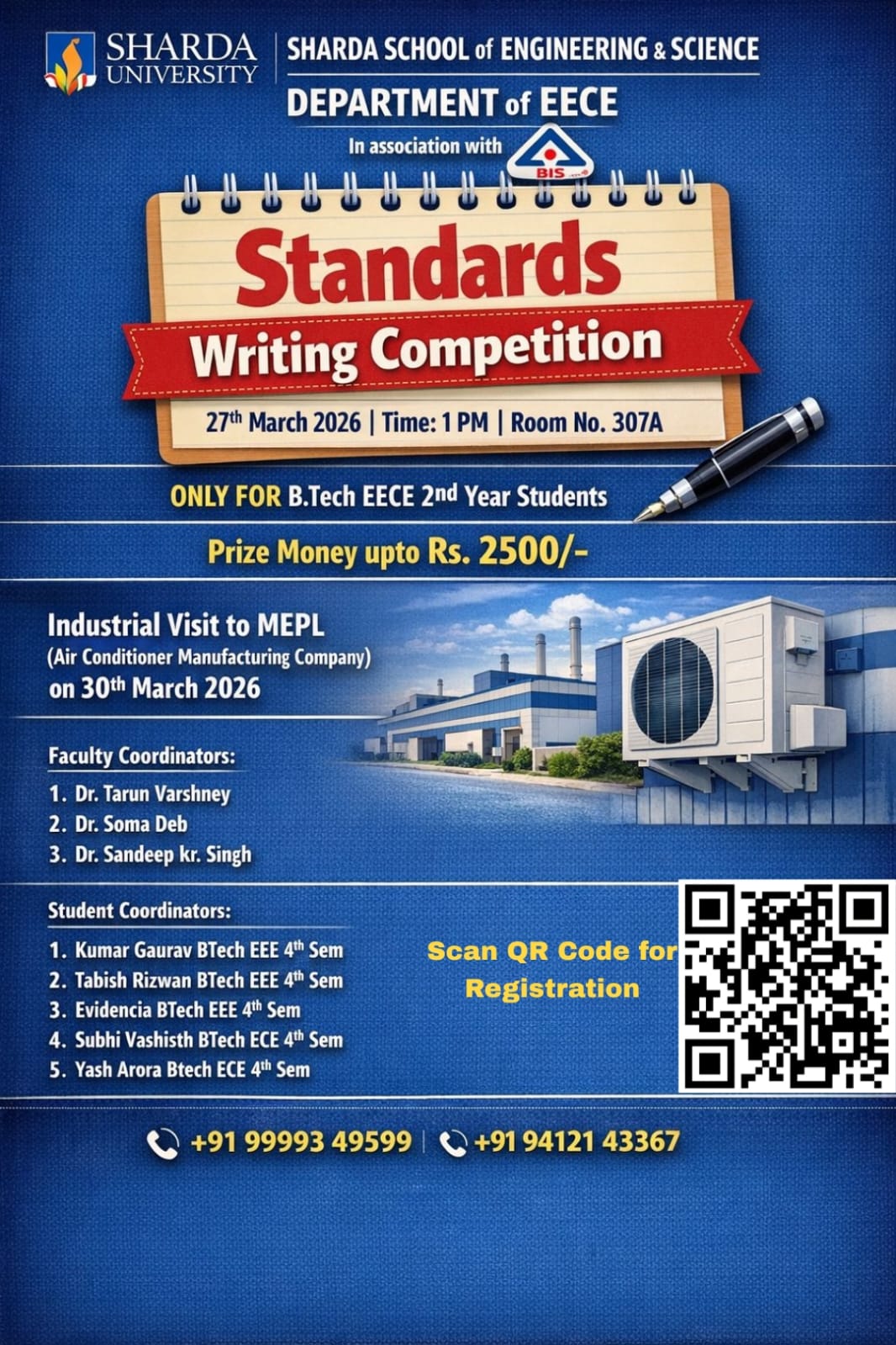 The Department of EECE, Sharda School of Engineering and Science, in collaboration with the Bureau of Indian Standards (BIS), is organizing two enriching student activities:  Standards Writing Competition on  27th March 2026 and an Industrial Visit to MEPL on 30th March, 2026 and an Essay Competition on 31st March 2026 titled “Significance of Quality Standards and Standardization in Electrical and Electronics Engineering.” These initiatives aim to provide students with practical exposure to manufacturing processes, energy efficiency practices, industry norms and standards and the importance of standardization in engineering.