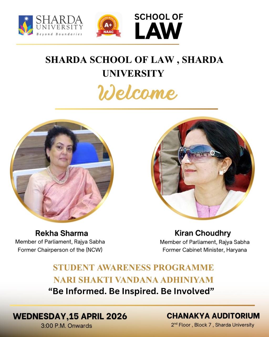 The Sharda School of Law takes great pride in organizing a Student Awareness Programme aimed at fostering informed understanding and dialogue among students regarding the significance of women’s representation in India’s democratic framework on Wednesday, 15 April 2026.