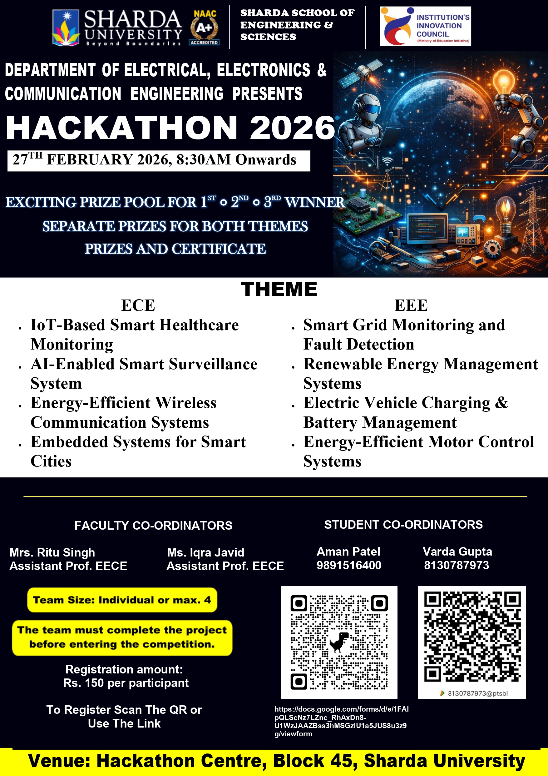 The Department of Electrical, Electronics and Communication Engineering (EECE) under the Sharda School of Engineering and Science along with IIC (Institution’s Innovation Council) Sharda University is organizing Hackathon 2026 for EECE students. This interdisciplinary event aims to foster innovation, creativity, and problem-solving skills by encouraging students to develop practical solutions to real-world engineering challenges.
