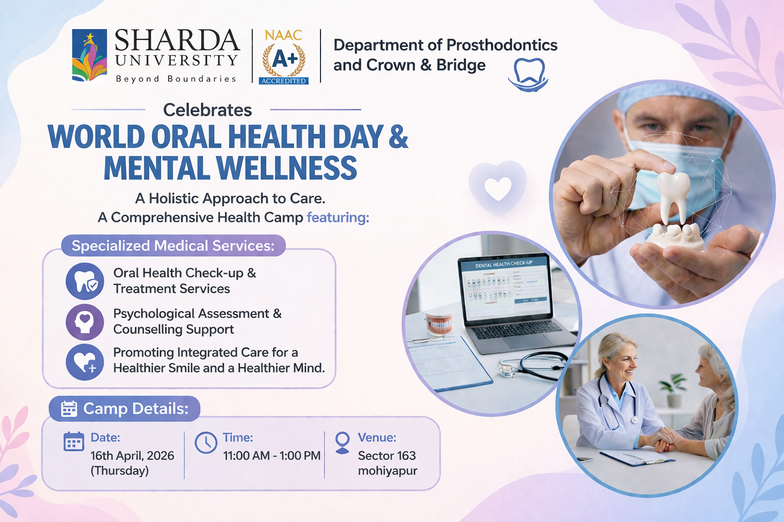 The celebration of World Oral Health Day & Mental Wellness aims to promote the importance of maintaining both oral and mental well-being as essential components of overall health. The event highlights how a healthy mouth contributes to a healthy body, while also emphasizing the significance of mental wellness in leading a balanced and fulfilling life.