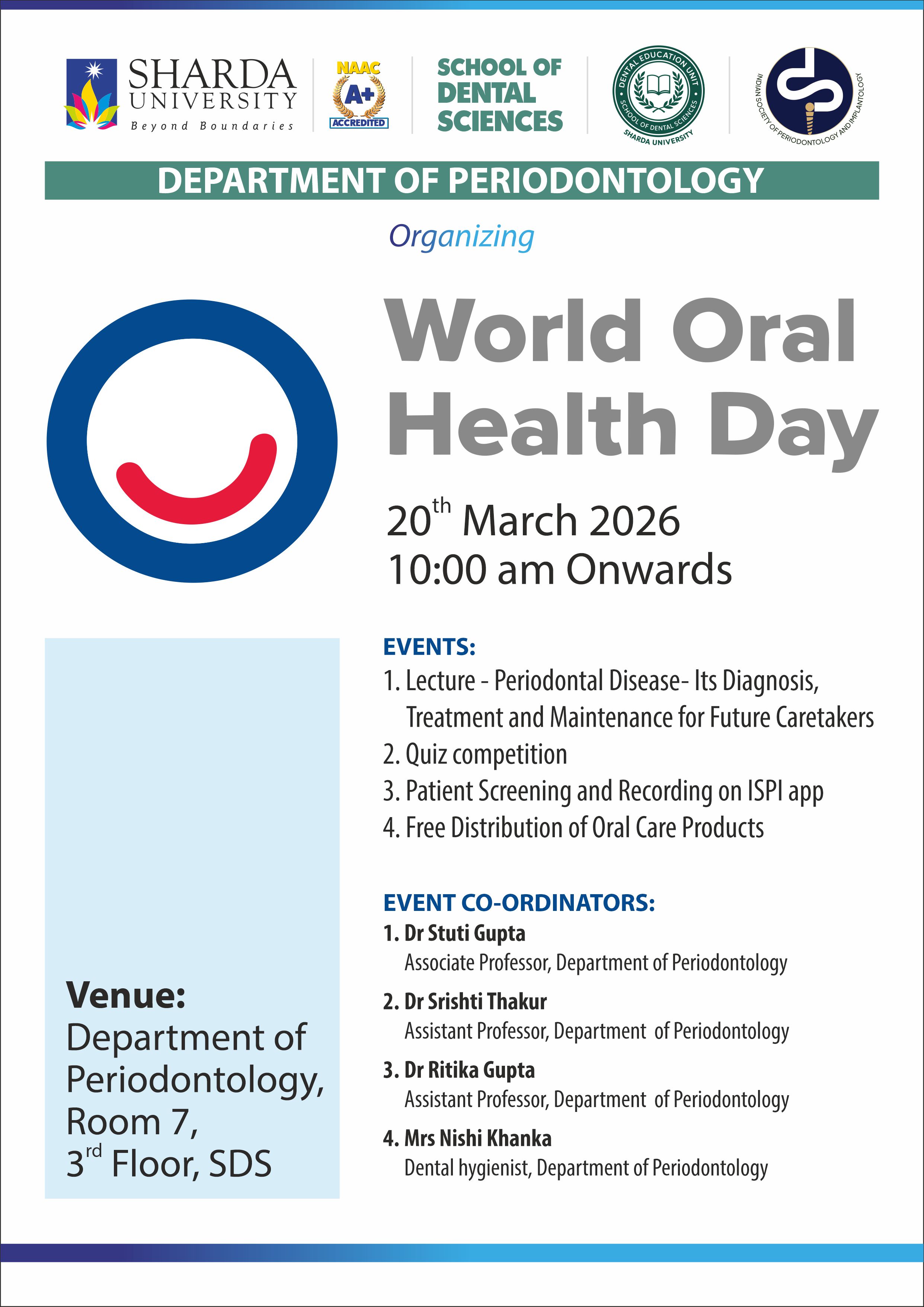 Department of Periodontology, School of Dental Sciences in collaboration with Indian Society of Periodontology & Implantology (ISPI) is celebrating World Oral Health Day(WOHD) on 20th March 2026.