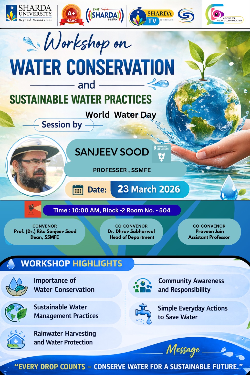 Sharda School of Media, Film and Entertainment is organizing an event on “World Water Day” on 23rd March 2026 at 10:00 AM for students, staff, and faculty members of the school. The event will be held in Room No. 504, Block-2, Sharda University, focusing on awareness about water conservation and sustainable practices.